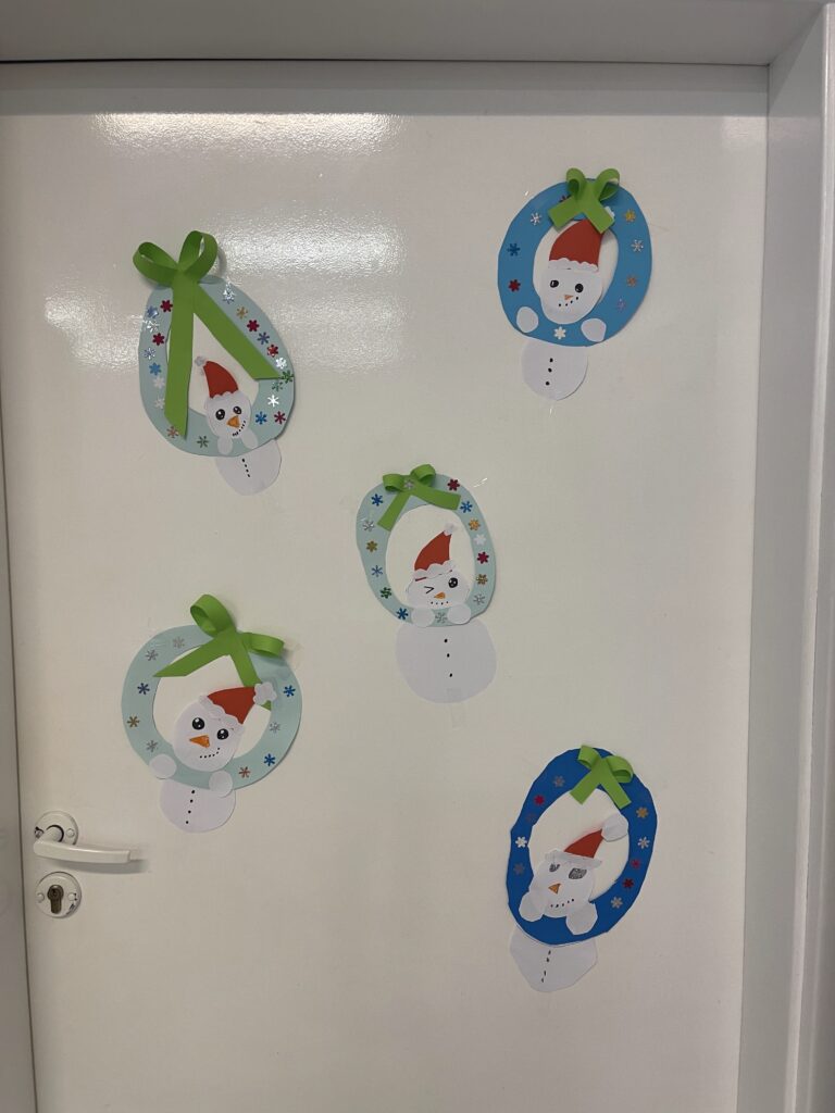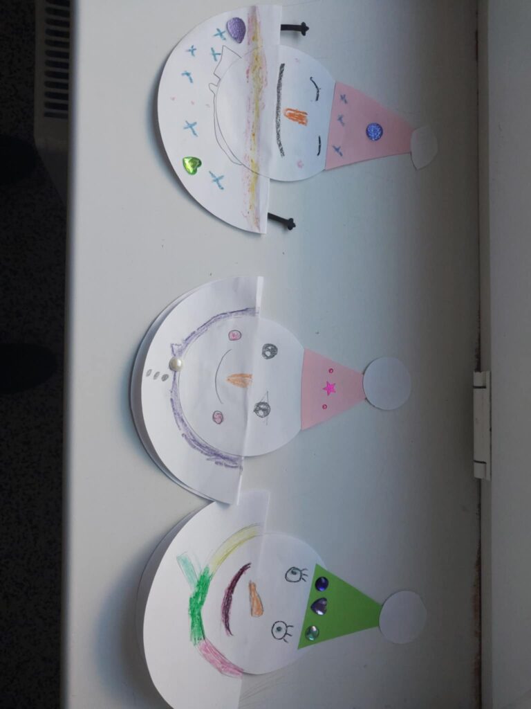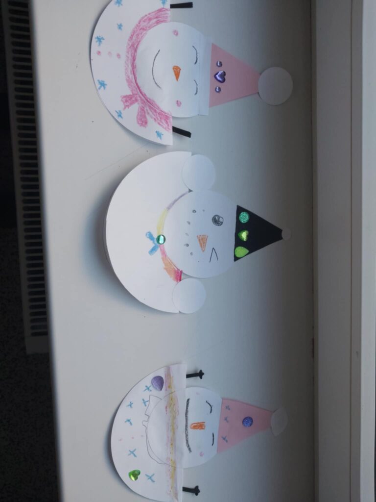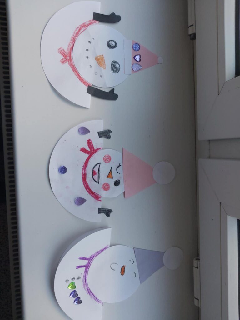 Powstały dwie różne prace przedstawiające bałwanki, wykonane z wykorzystaniem różnych technik i materiałów.