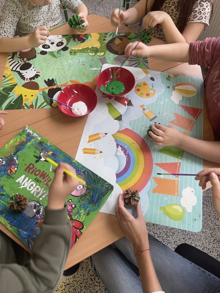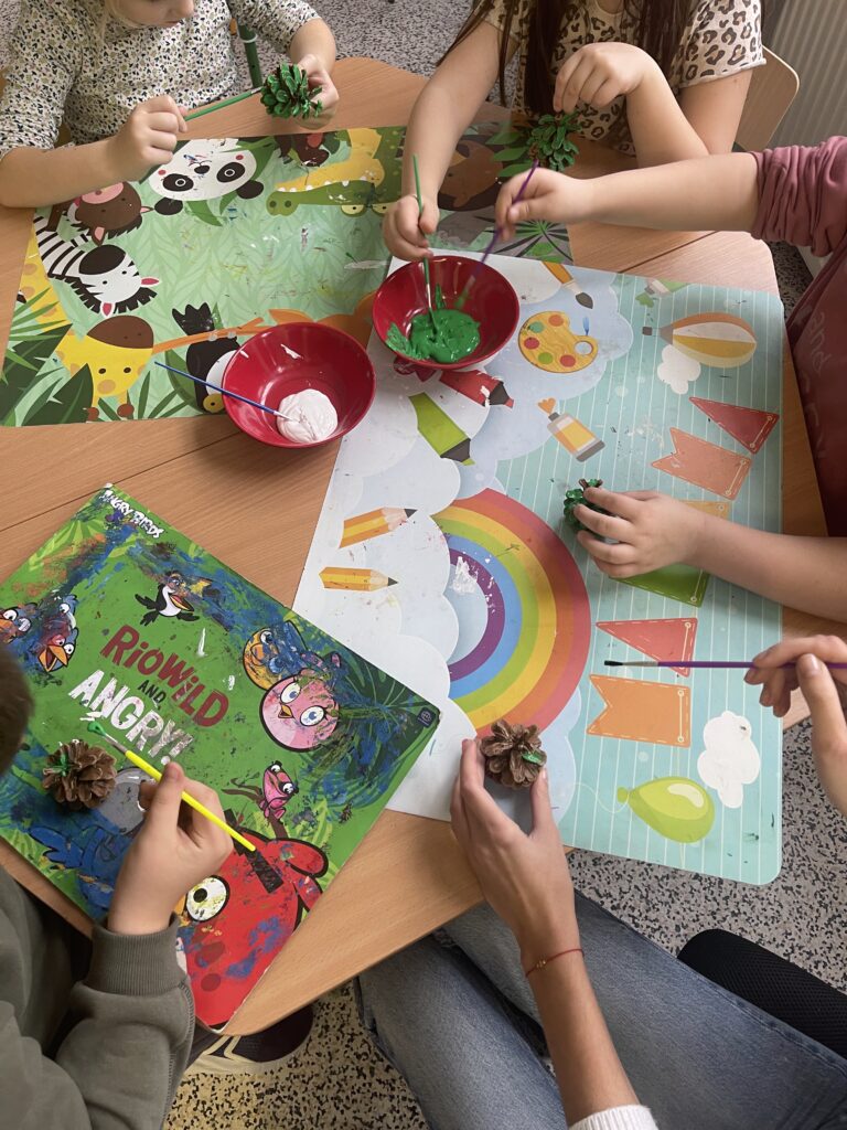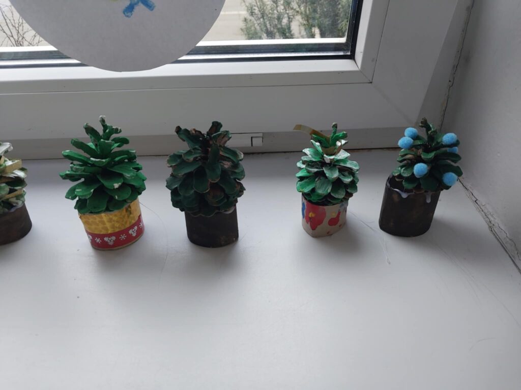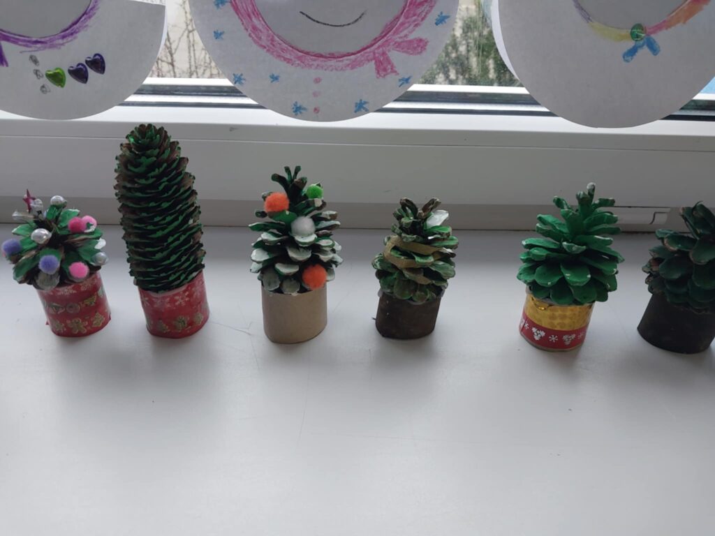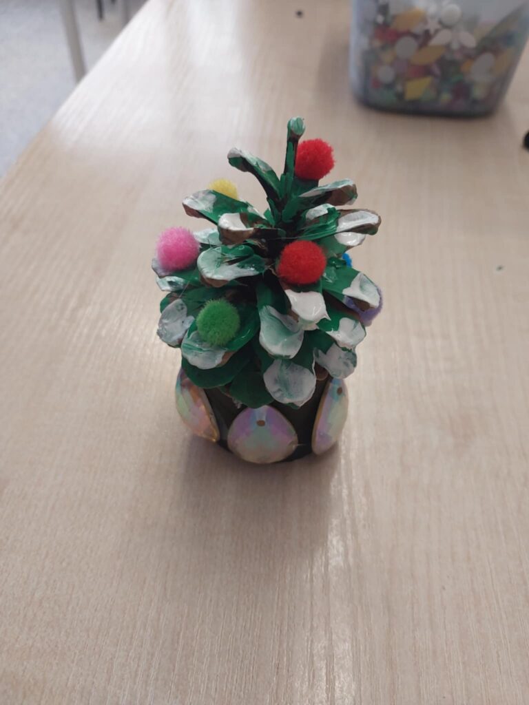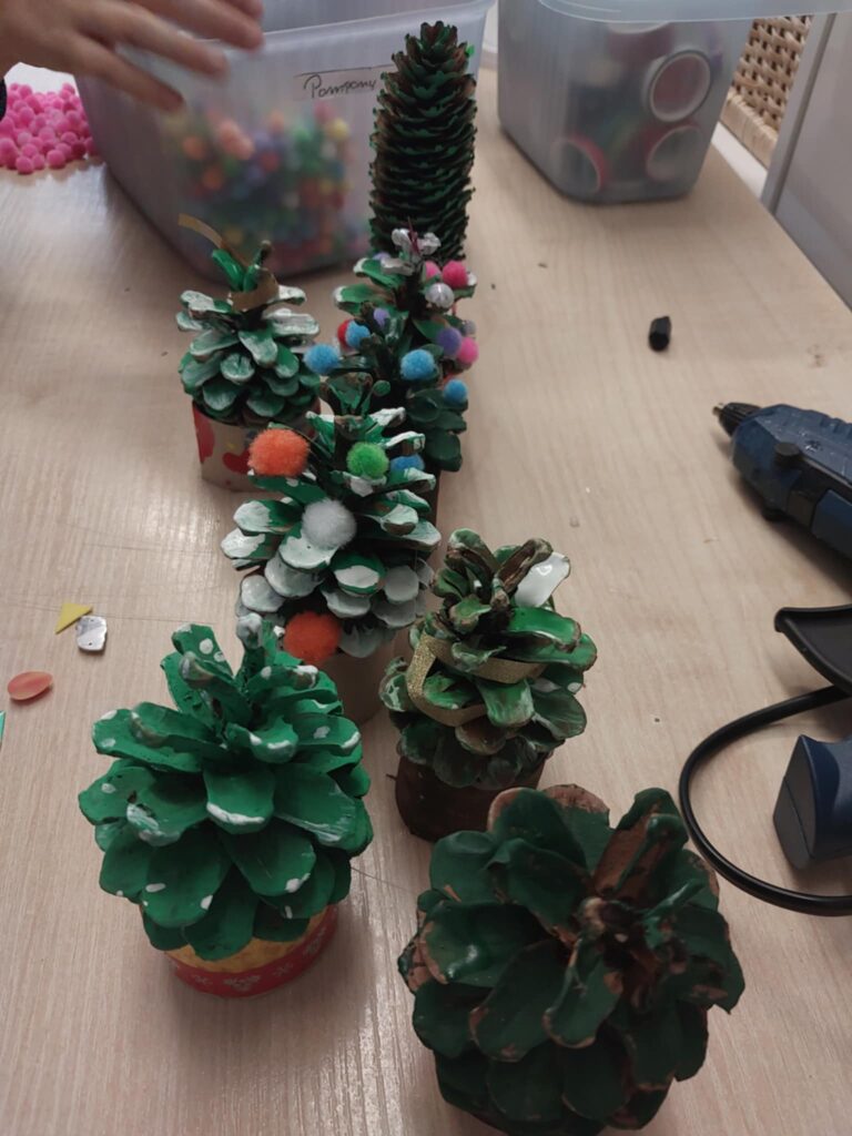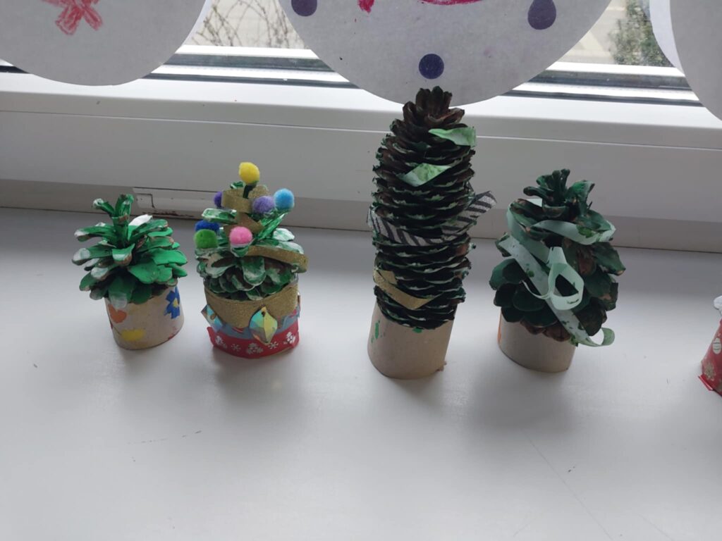 Dużym zainteresowaniem cieszyły się również choinki z szyszek, które dzieci samodzielnie ozdabiały, rozwijając kreatywność i zdolności manualne.