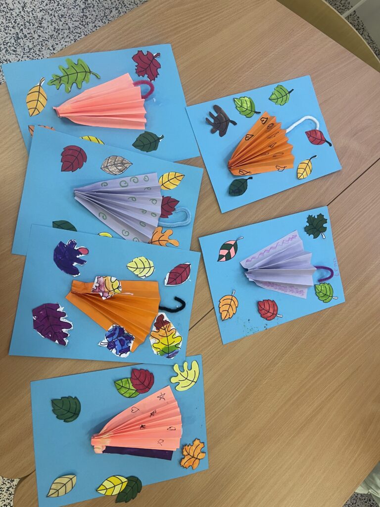 Powstały urocze jeże z odcisków dziecięcych rączek, które zachwyciły wszystkich swoją pomysłowością. Nie zabrakło także kolorowych parasoli oraz jesiennych drzewek z papieru i plasteliny umieszczonych na talerzykach, które pięknie ozdobiły naszą świetlicę.