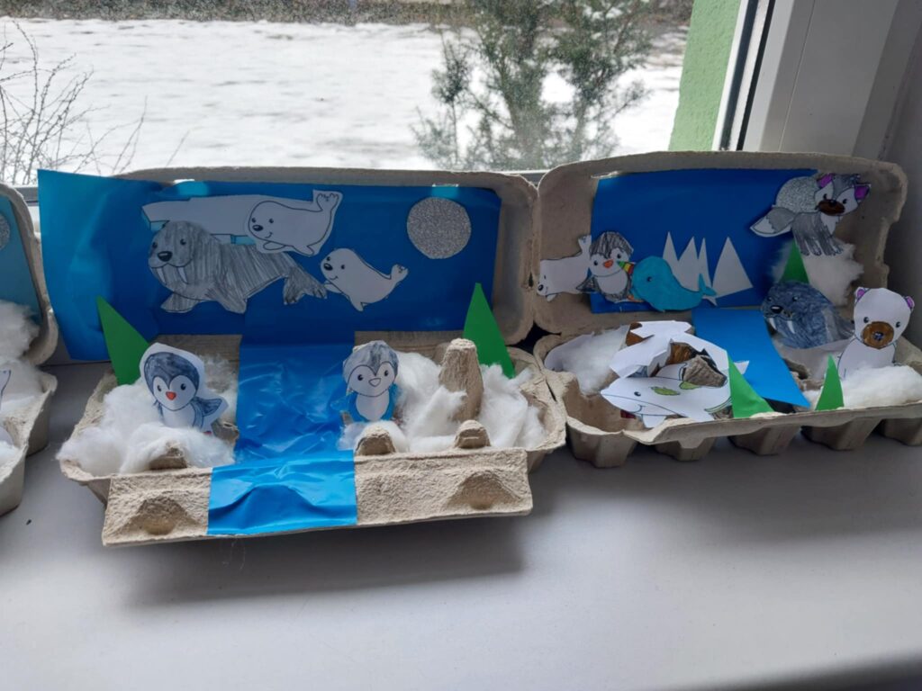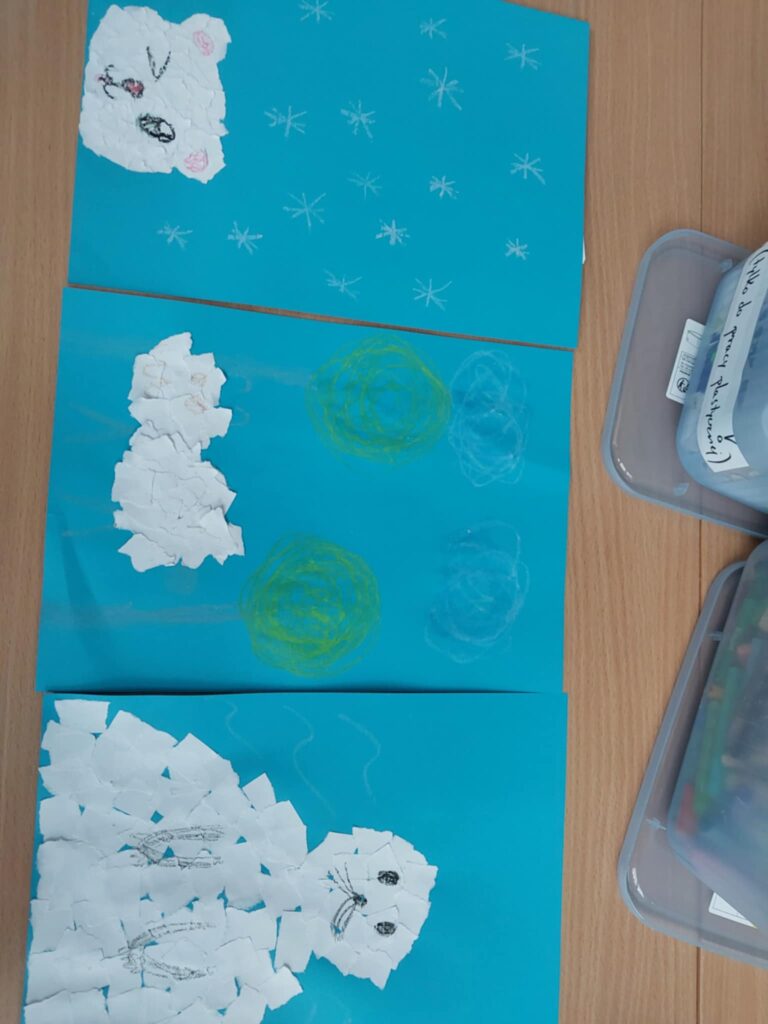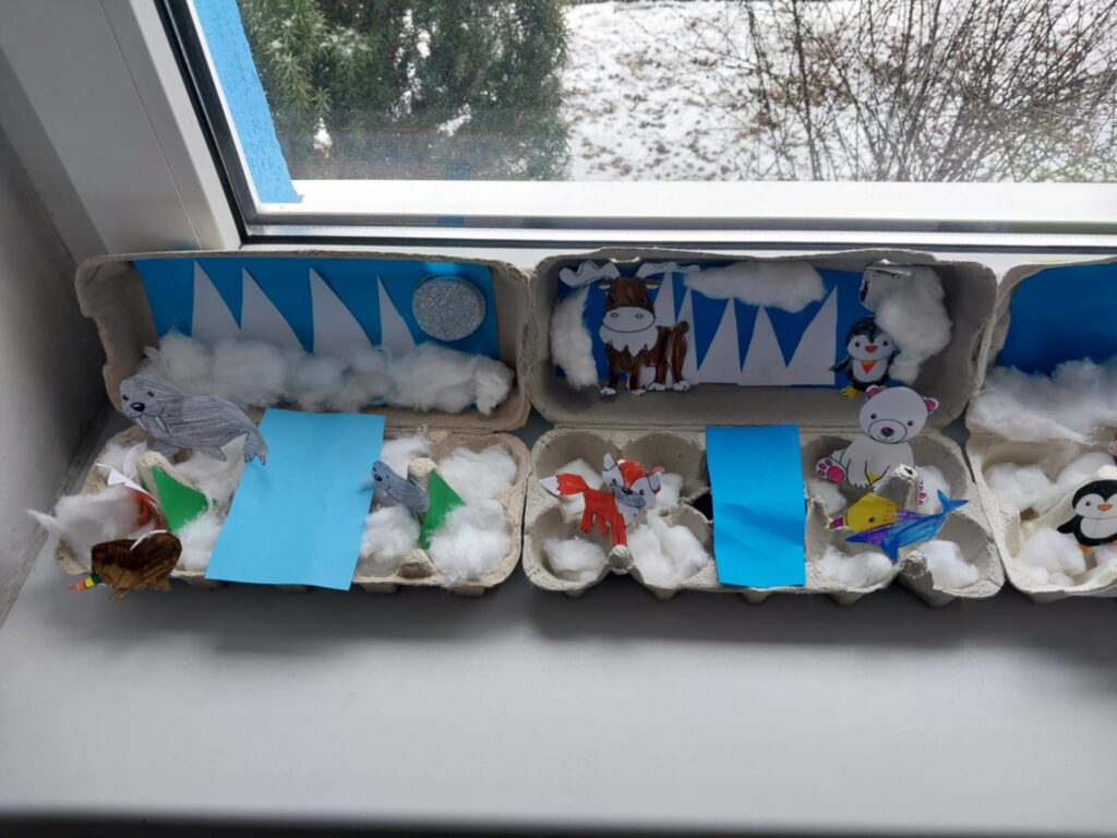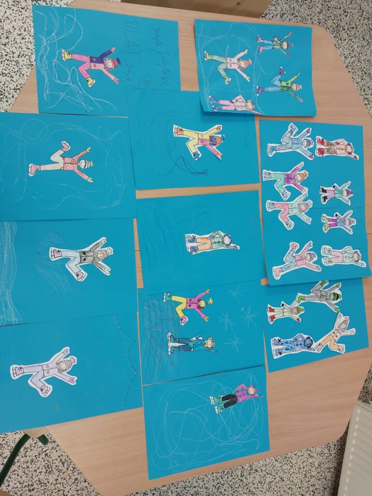 W tym tygodniu w naszej świetlicy zrobiło się naprawdę zimowo. Dzieci poznawały zwierzęta Arktyki i Antarktydy – pingwiny, niedźwiedzie polarne oraz lisy arktyczne, które stały się inspiracją do różnorodnych prac plastycznych. Dzieci tworzyły również kolorowe kartki z origami. Rozmawialiśmy również o bezpiecznych feriach zimowych, a dzieci rozwiązywały zagadki związane z zasadami bezpieczeństwa podczas zimowych zabaw. Uzupełnieniem zajęć były prace plastyczne przedstawiające łyżwy, podkreślające zimowy klimat tygodnia.