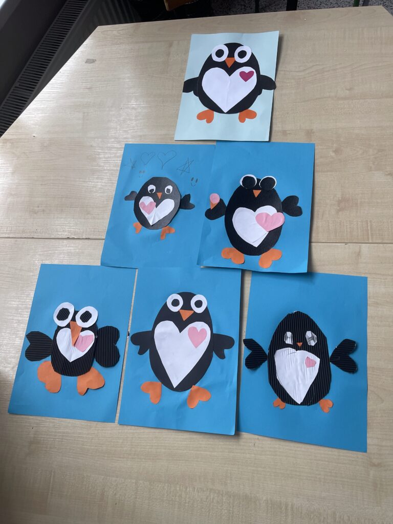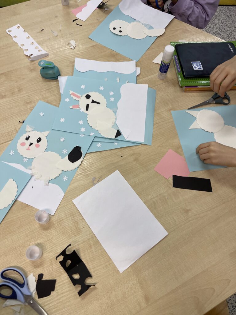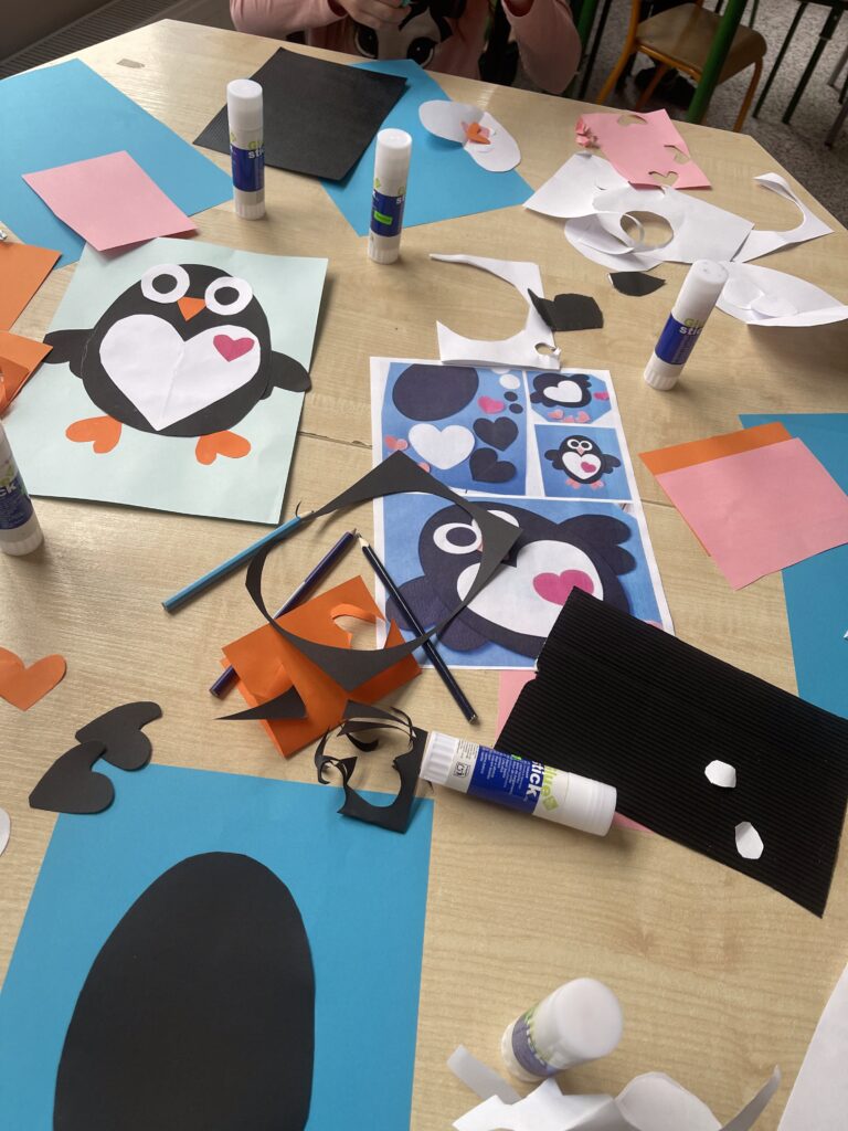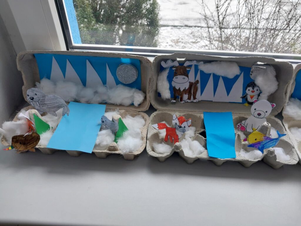 W tym tygodniu w naszej świetlicy zrobiło się naprawdę zimowo. Dzieci poznawały zwierzęta Arktyki i Antarktydy – pingwiny, niedźwiedzie polarne oraz lisy arktyczne, które stały się inspiracją do różnorodnych prac plastycznych. Dzieci tworzyły również kolorowe kartki z origami. Rozmawialiśmy również o bezpiecznych feriach zimowych, a dzieci rozwiązywały zagadki związane z zasadami bezpieczeństwa podczas zimowych zabaw. Uzupełnieniem zajęć były prace plastyczne przedstawiające łyżwy, podkreślające zimowy klimat tygodnia.