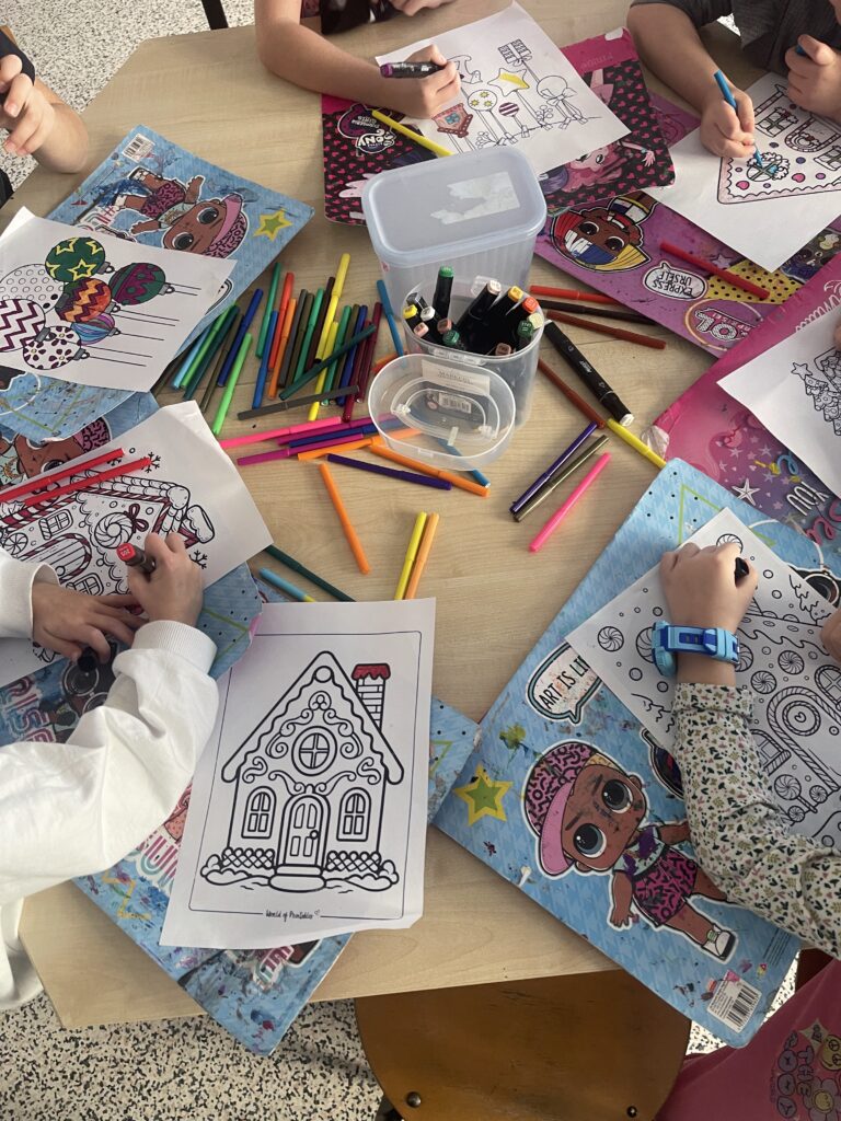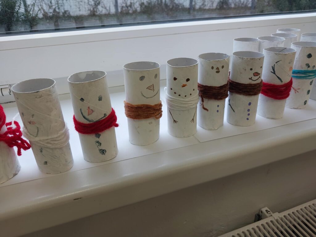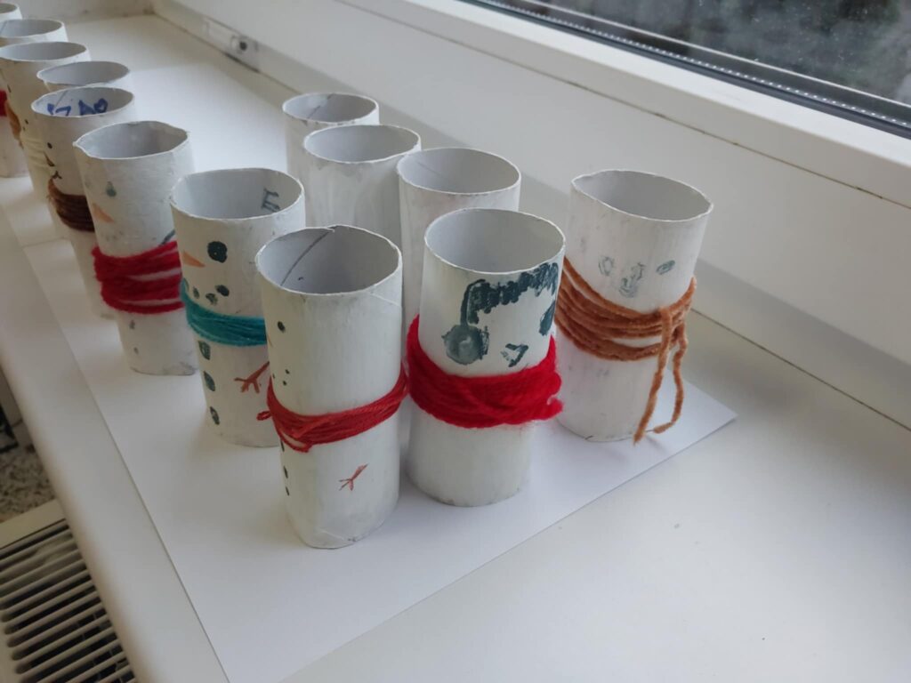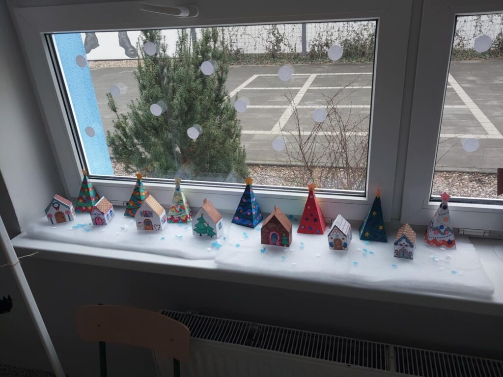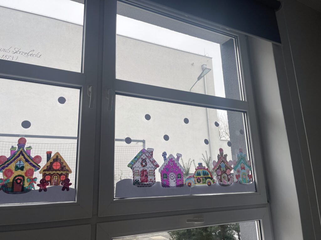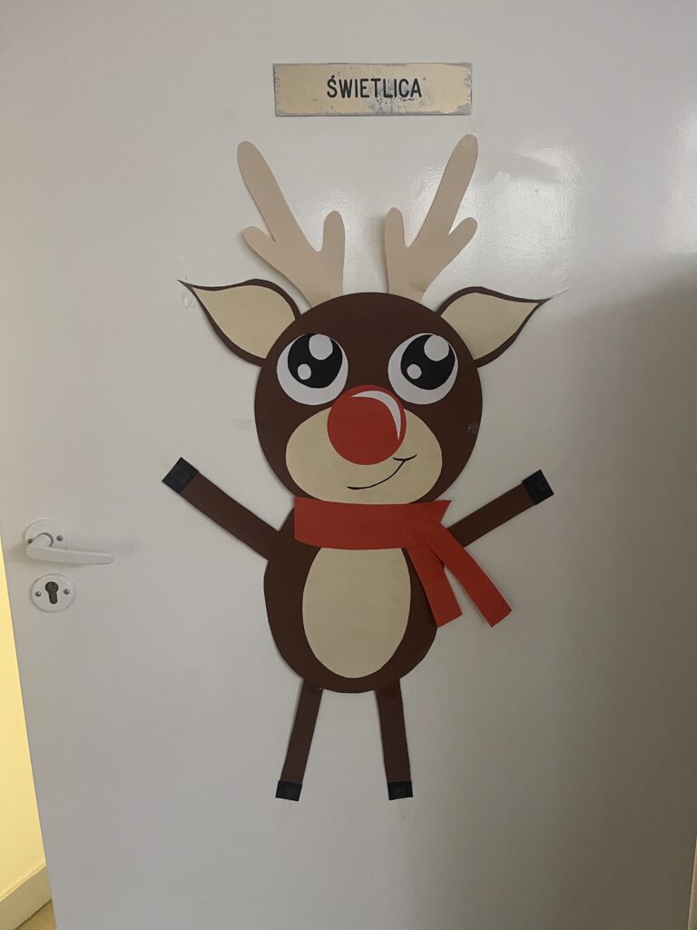 Na drzwiach zawisł duży renifer, który od razu wprowadził wszystkich w świąteczny nastrój. Na parapecie pojawiła się również zimowa wioska, tworząc nastrojową, bajkową dekorację. To był pełen kreatywności i radości tydzień!